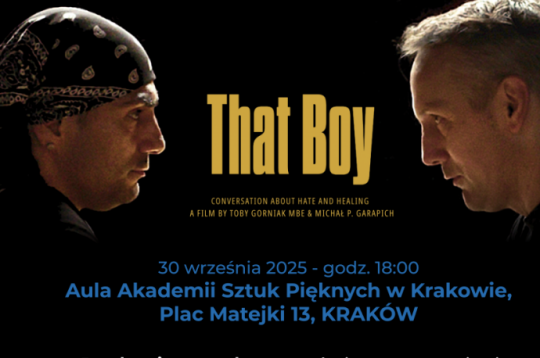 W najbliższy wtorek, 30 września w godz. 18.00–20.00 w Akademii Sztuk Pięknych im. Jana Matejki przy pl. Matejki 13 odbędzie się projekcja filmu „That Boy: A Conversation about Hate and Healing” (Ten chłopak: rozmowa o nienawiści i uzdrowieniu), połączona z dyskusją panelową. Wstęp wolny.