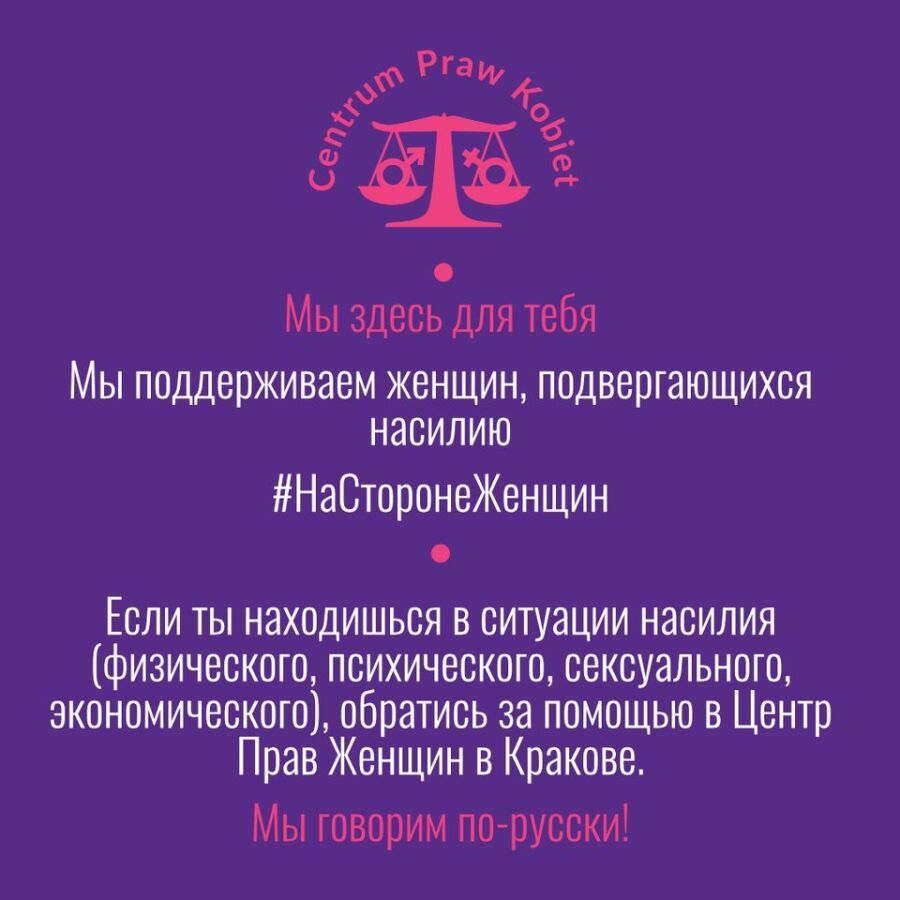 Если ты находишься в ситуации насилия (физического, психического, сексуального, экономического), обратись за помощью в Центр Прав Женщин в Кракове. Мы говорим по-русски!