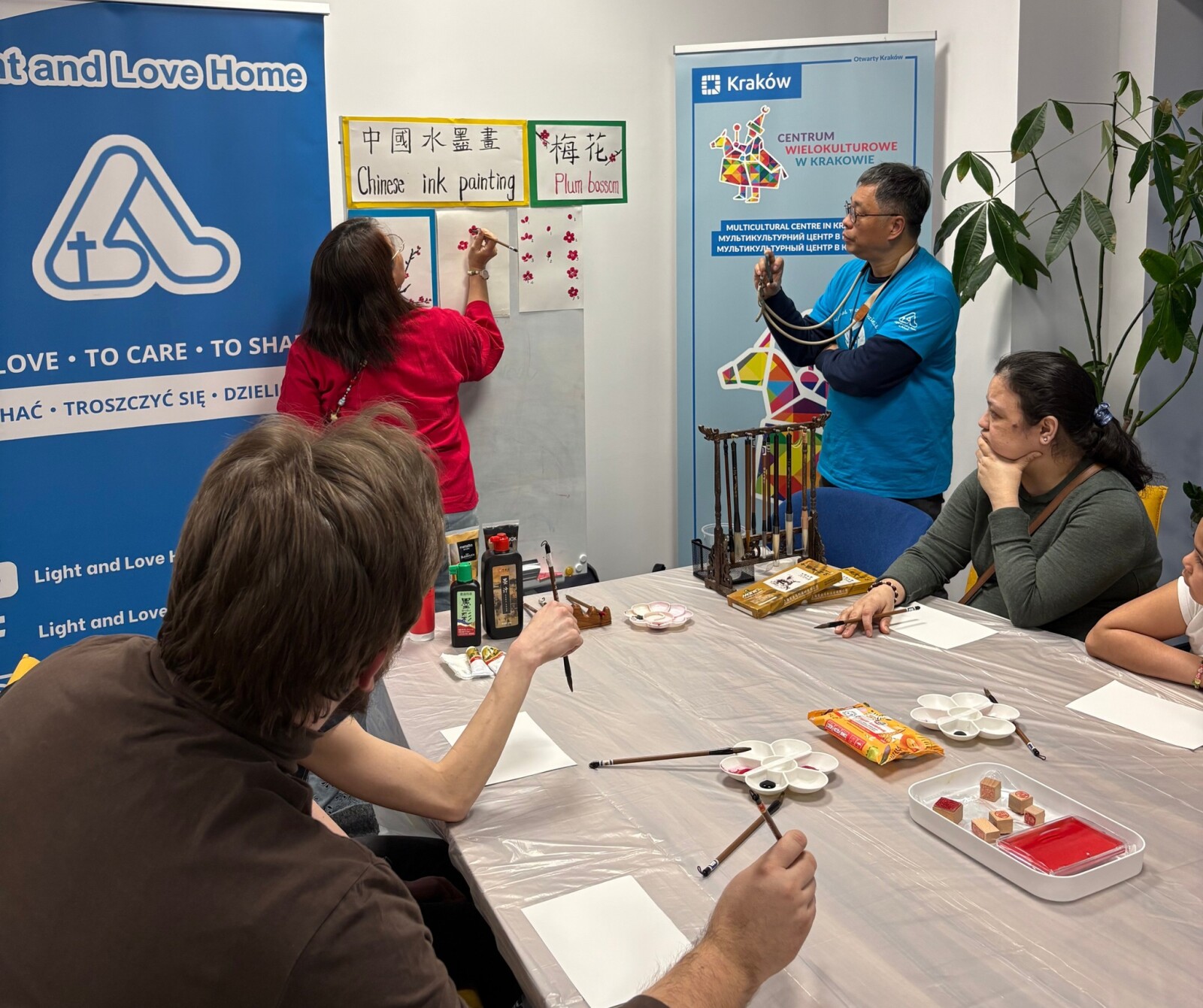 Po części informacyjnej przyszedł czas na wspólne świętowanie. Program wydarzenia wypełniły warsztaty i aktywności przygotowane przez społeczności współtworzące Centrum Wielokulturowe. Uczestnicy mogli wziąć udział w warsztatach akwareli prowadzonych przez zespół Klubu Ukraińskiego w Krakowie – Fundacji Zustricz, spróbować swoich sił w tradycyjnym chińskim malarstwie tuszem podczas zajęć przygotowanych przez Light and Love Home in Poland, a także poznać podstawowe ruchy indyjskiego tańca Lezim podczas warsztatów prowadzonych przez Dipikę Disale.